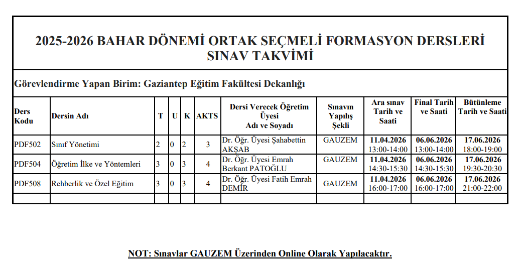 2025-2026 BAHAR DÖNEMİ ORTAK SEÇMELİ FORMASYON DERSLERİ SINAV TAKVİMİ